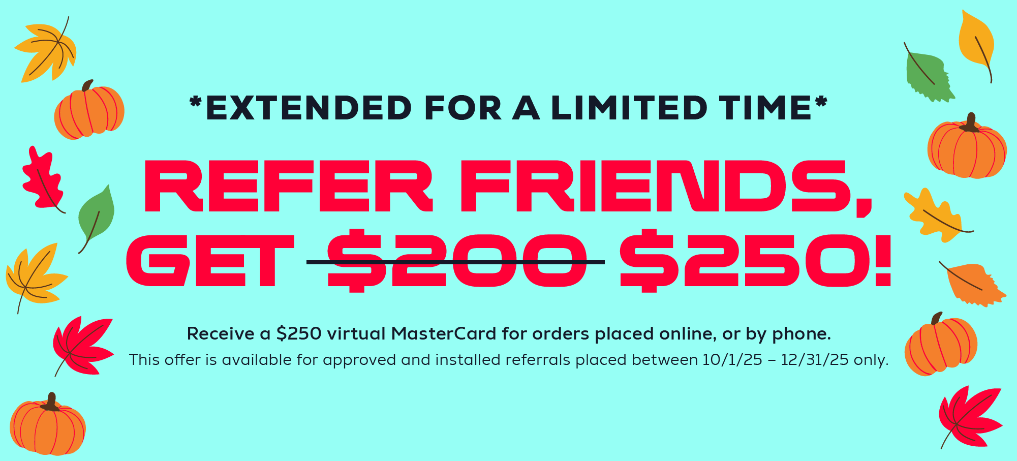 All referrals submitted and approved from 11/1-11/14 will earn an EXTRA $50 Amazon eGift Card on top of your regular referral reward. This means a total reward of $300 EACH for orders place online or by phone!